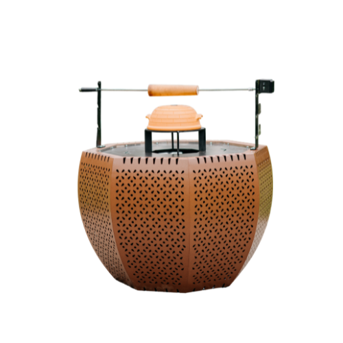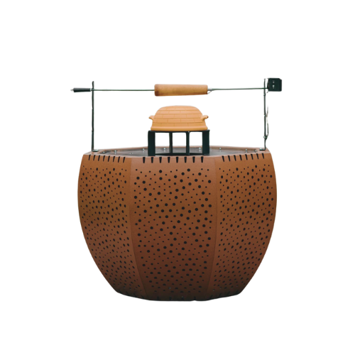 Die pulverbeschichtete Oberfläche in charakteristischem Rostbraun wird durch eine wasserabweisende Abdeckung und einen passenden Grilldeckel ergänzt, die beide im Lieferumfang enthalten sind.